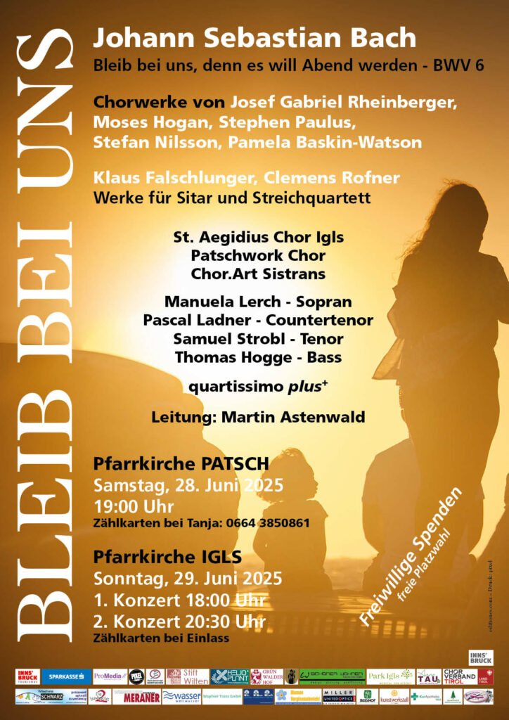 BLEIB BEI UNS29. Juni 202511. Dezember 2025St. Aegidius Chor - Chronik Live YouTube Bilder vom Konzert in Patsch, 28.6.2025 Konzert in Igls, 29.6.2025 Der Igel schreibt Der Igel_73_2025_Bach und Sitar – ist das eine gute Idee? Diesen Beitrag in sozialen Netzwerken teilen!Vorheriger BeitragWallfahrtsmesse HeiligwasserNächster BeitragRequiem für Anna Weber