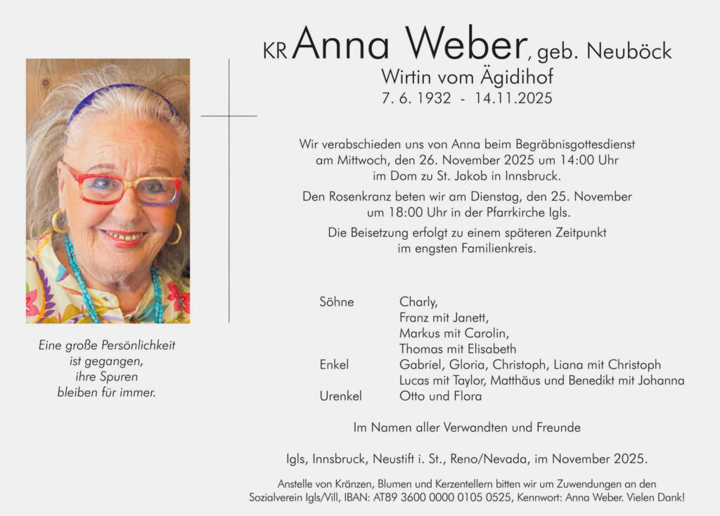 Der St. Aegidius Chor bedankt sich bei Anna Weber (7.6.1932 – 14.11.2025), die den Chor über die Jahre gastfreundlich und herzlich unterstützt hat. Wir verabschieden uns musikalisch von einer besonderen Personen. R.E.P.